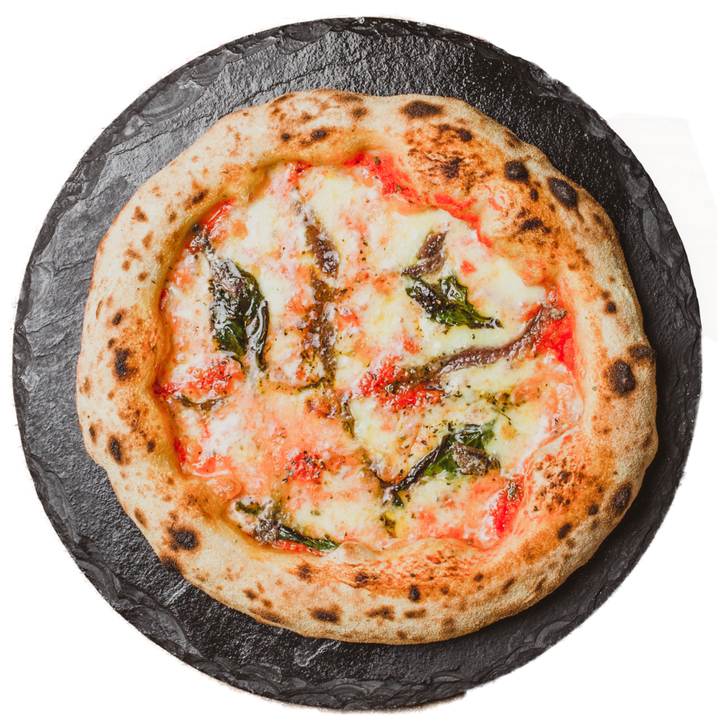 massa de longa fermentação, molho de tomate italiano, mozzarela artesanal, parmesão ralado e manjericão